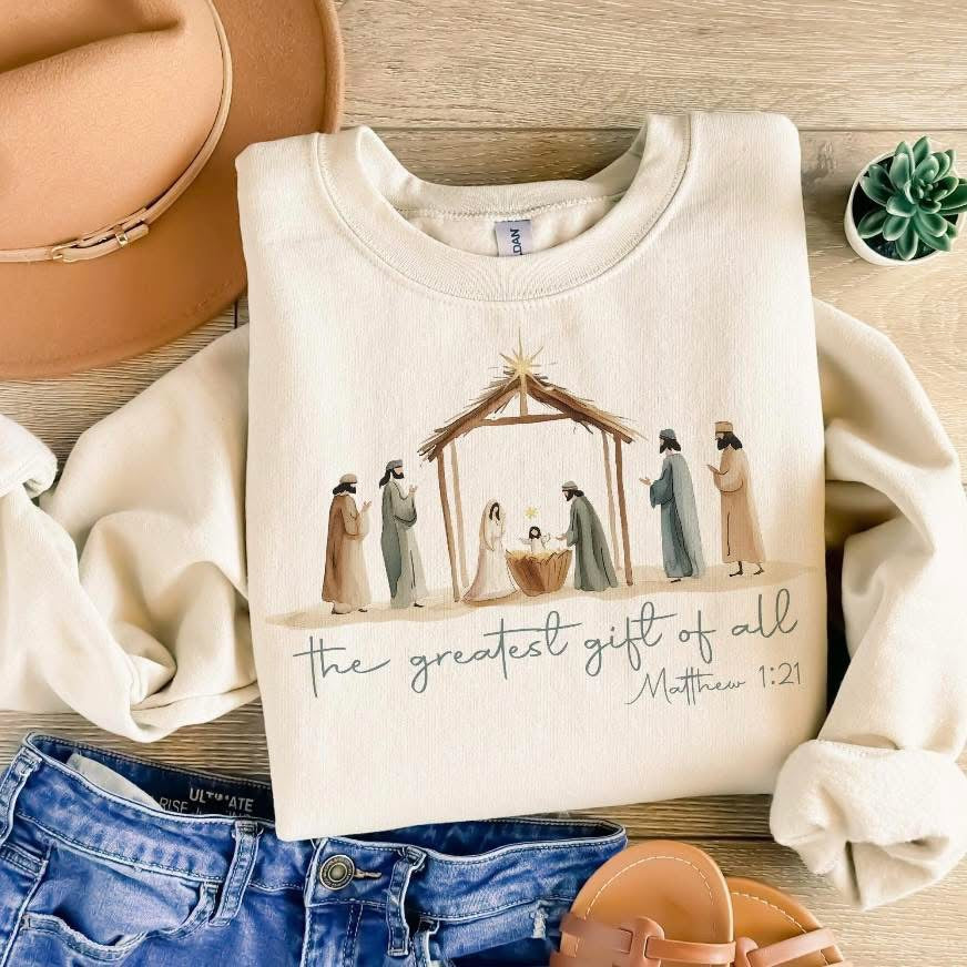 This is a beautiful design for the Christmas Season! You are able to choose your size and if you want a short sleeve, long sleeve or sweatshirt! Only color option is cream.